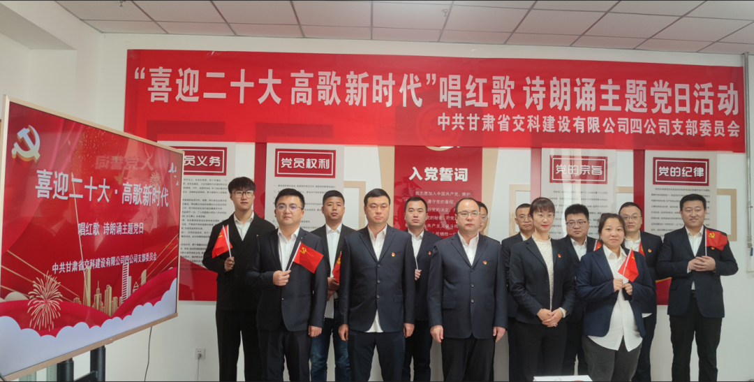 金秋十月,偉大的中國共產(chǎn)黨即將迎來第二十次全國代表大會(huì),為營造喜慶、熱烈、昂揚(yáng)、振奮的濃厚氛圍,交科公司四公司黨支部于10月9日組織開展了“喜迎二十大 高歌新時(shí)代”唱紅歌、詩朗誦主題黨日活動(dòng)。以紅歌獻(xiàn)唱、詩歌朗誦的方式,回顧黨的光輝歷程,謳歌黨的豐功偉績,進(jìn)一步激發(fā)廣大職工的愛黨愛國熱情,展現(xiàn)了四公司全體職工昂揚(yáng)向上、奮發(fā)有為的精神風(fēng)貌。