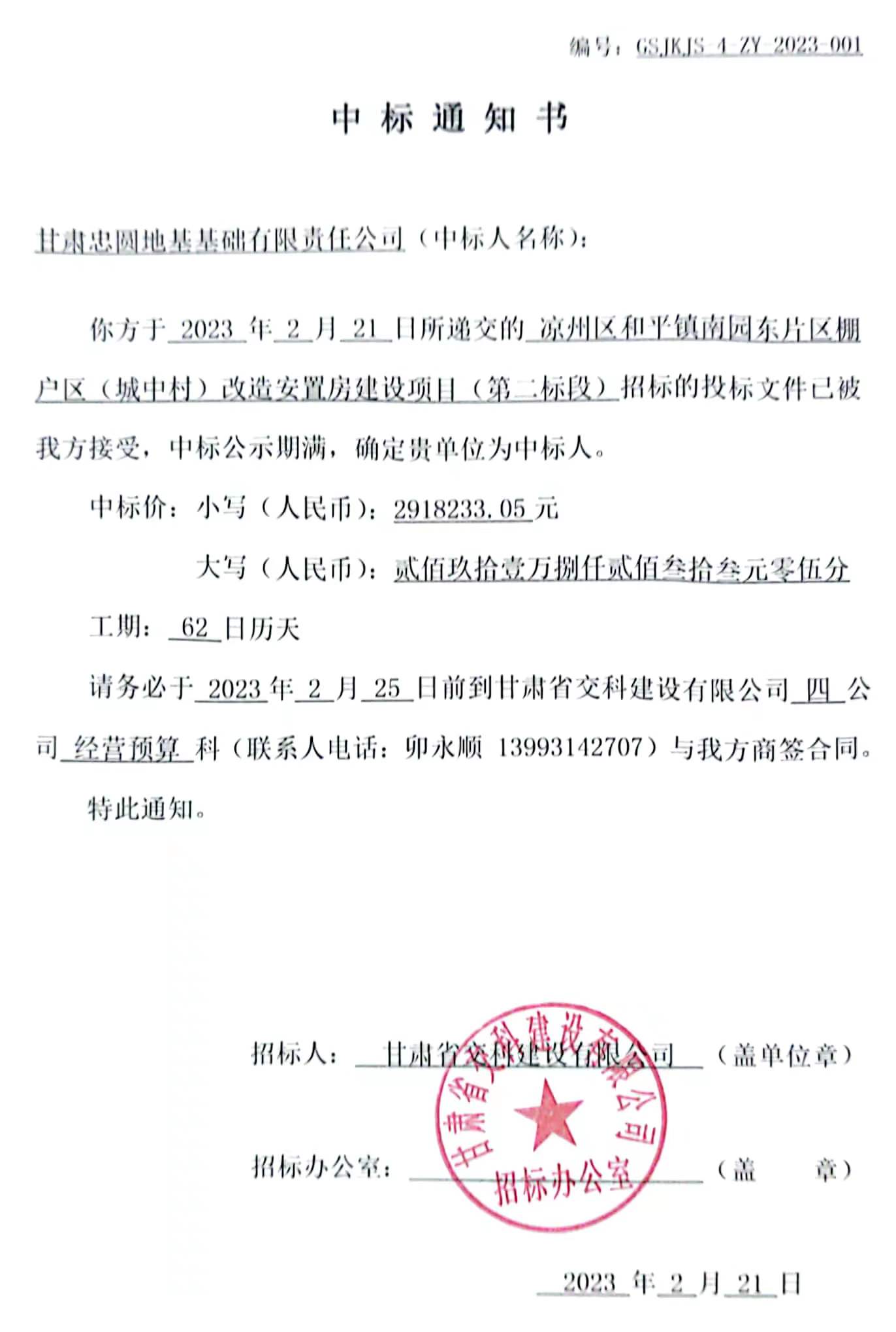 涼州區(qū)和平鎮(zhèn)南園東片區(qū)棚戶區(qū)(城中村)改造安置房建設項目(第二標段)中標候選人及中標通知書
