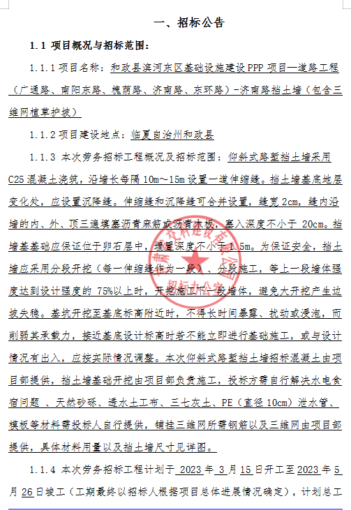 和政縣濱河東區(qū)基礎設施建設PPP項目—道路工程(廣通路、南陽東路、槐蔭路、濟南路、東環(huán)路)-濟南路擋土墻(包含三維網(wǎng)植草護坡)招標公告