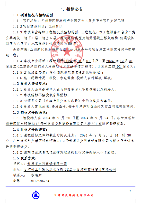 蘭州新區(qū)新材料產(chǎn)業(yè)園區(qū)公共服務(wù)平臺項目安裝工程-招標公告