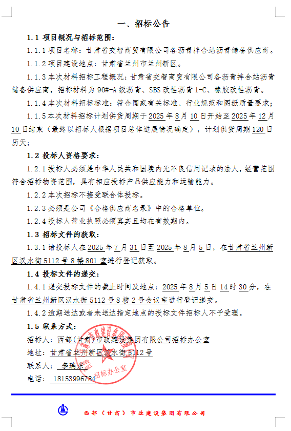 甘肅省交智商貿(mào)有限公司各瀝青拌合站瀝青儲備供應商-材料招標公告