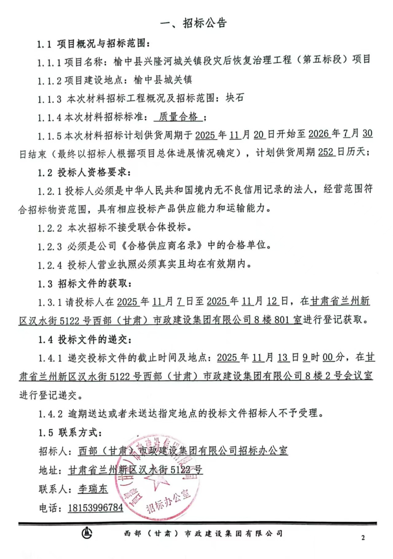 榆中縣興隆河城關(guān)鎮(zhèn)段災(zāi)后恢復(fù)治理工程(第五標(biāo)段)項(xiàng)目-塊石招標(biāo)公告